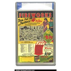 More Fun Comics #56 (DC, 1940) CGC FN- 5.5 White pages. After his introductory issue, Dr. Fate scores his first cover, and what a cover it is! Locked in heated battle with his arch-nemesis, Fate fights for his distressed damsel against a smoke-filled backdrop of a large, menacing statue. Without a doubt one of the best covers DC ever produced during the Golden Age. This copy appears FN+ with white pages and deep colors, but suffers from a small 1/8" wormhole through the bottom left front cover. This comic is quite scarce, and rarely turns up in any condition better than VG. Overstreet 2002 FN 6.0 value = $1,500. Important notice: We expect to be auctioning lots at the rate of 200-250 per hour. Sometimes eBay Premier live bid software cannot keep up with that pace, so we strongly recommend that you place a realistic proxy bid now as insurance to avoid disappointment. Also please note that all Heritage/CAA lots purchased through eBay Premier carry a 20% Buyer's Premium. Please make sure you read the Terms and Conditions.