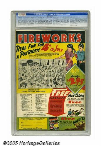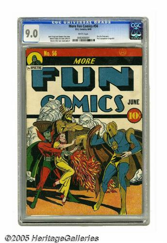 <B>More Fun Comics #56 (DC, 1940) CGC VF/NM 9.0 White pages.</B></I> This is one of the most valuable issues of this title's run, and it's scarce one as well (a Gerber "8"). It's got the first cover appearance of Dr. Fate (his second appearance overall). The Howard Sherman cover showing Dr. Fate (a future Justice Society member) is called "classic" by Overstreet. The issue also tells the second half of Dr. Fate's origin. Also, contrary to what some books will tell you, Congo Bill made his first appearance in this very issue, which pre-dates his later <B>Action Comics</B></I> appearances. And of course, there's an early Spectre appearance with art by Bernard Baily. Overstreet 2005 VF/NM 9.0 value = $6,896; NM- 9.2 value = $9,500. CGC census 7/05: 1 in 9.0, 1 higher.