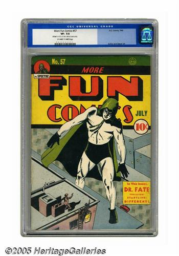 <B>More Fun Comics #57 (DC, 1940) CGC VF- 7.5 Off-white to white pages.</B></I> Putting together a complete run of <B>More Fun</B></I> would be a tall order to say the least, but we're doing our best to help you with a wide selection of these hard-to-find books.This one's a Gerber "7." It contains very early appearances of the Spectre, Dr. Fate, and Congo Bill, who had first appeared shortly before, in #52, 55, and 56 respectively. The cover and the Spectre feature were drawn by Bernard Baily. CGC notes, "From the collection of Nicolas Cage." Overstreet 2005 VF 8.0 value = $2,379. CGC census 4/05: 1 in 7.5, 2 higher. <I>From the Northern Lights Collection.</B></I>