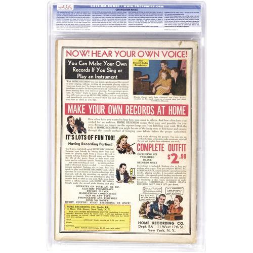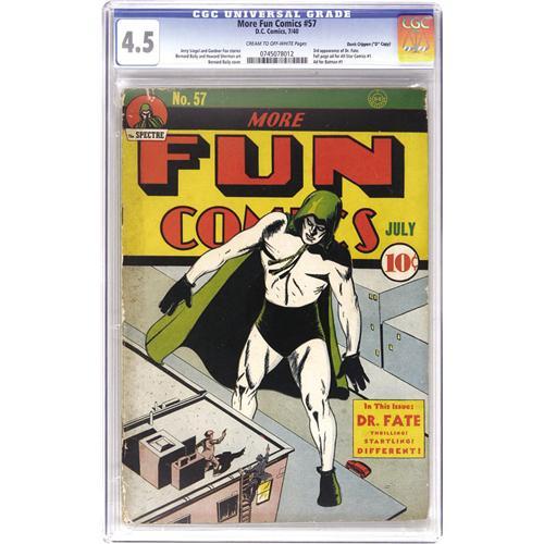 <B>More Fun Comics #57 Davis Crippen ("D" Copy) pedigree (DC, 1940) CGC VG+ 4.5 Cream to off-white pages.</B></I> A <B>More Fun</B></I> with a Spectre cover is something no right-thinking Golden Age collector could pass by! This one's a Gerber "7," and it contains very early appearances of the Spectre, Dr. Fate, and Congo Bill, who had first appeared shortly before, in #52, 55, and 56 respectively. The cover and the Spectre feature were drawn by Bernard Baily. Overstreet 2006 VG 4.0 value = $748. CGC census 6/06: 2 in 4.5, 5 higher. <I>From the Crippen Collection.</B></I> <BR><BR><B>Important notice:</B> Heritage usually auctions material at the rate of 200-250 lots per hour. On some occasions eBay Live bid software or the Internet may not be able to keep up with the pace of the auction. We recommend placing a realistic absentee bid now as insurance to avoid disappointment. Occasionally the auctioneer may eliminate or reject an eBay Live bid, and the auctioneer may also reopen a lot after the close of the eBay live bidding (usually because we missed an audience bid), and may reject your bid even if it shows you as the winning bidder. By bidding via eBay Live, you agree that Heritage may award the lot to another bidder at its sole discretion under the circumstances described above or any other reasonable circumstances. Since eBay bids are not shown to us until we open the lot on the floor, we treat those bids just like floor bids. In most cases the floor responds before the eBay bid is presented to us, due to Internet lag time, so for consistency we have made it a policy that floor bids are always considered first over tie eBay live bids. Also please note that all Heritage lots purchased through eBay Live carry a 22.5% Buyer's Premium. Please make sure you read the Terms and Conditions before you bid. This lot is being auctioned in conjunction with a live floor auction by Heritage Auction Galleries. All final auction and invoice information will be supplied by Heritage Auction Galleries, and all other information should be considered preliminary. Lot:41001 <BR><BR><B>Winning Notification and Billing:</B> After the FINAL session in this auction is complete, Heritage will send e-mail and snail mail invoices. This process normally takes several days. All final auction and invoice information will be supplied by Heritage Auction Galleries, and all other information should be considered preliminary. <BR><BR>This auction will be conducted on a live auction floor and over the Internet through eBay Live. If you choose to place an absentee bid, please take a moment to <font color='#0000ff'><u><a href='http://pages.ebay.com/liveauctions/help/before/laabsentee.html'>learn how eBay Live absentee bidding works</a></u></font><font color='#000000'>