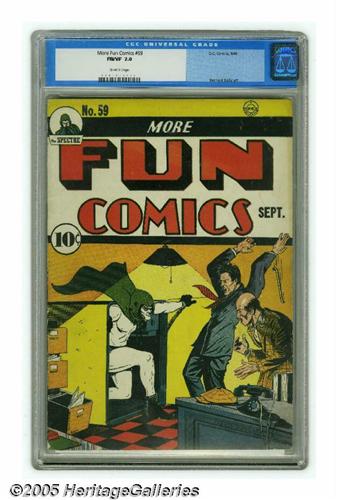 <B>More Fun Comics #59 (DC, 1940) CGC FN/VF 7.0 Off-white pages.</B></I> Many consider the work Bernard Baily did on the Spectre covers for this title were his most distinctive. Overstreet 2005 FN 6.0 value = $1,098; VF 8.0 value = $2,379. CGC census 1/05: 1 in 7.0, 3 higher. <I>From the Northern Lights Collection</B></I>.