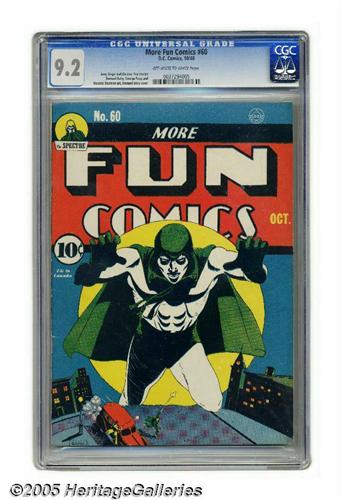 <B>More Fun Comics #60 (DC, 1940) CGC NM- 9.2 Off-white to white pages.</B></I> The Spectre has never looked more fearsome than on this Bernard Baily cover... come to think of it, he's never looked <I>better</B></I> than on this 9.2 copy! The Spectre's adventure inside the book was also drawn by Baily. Another future Justice Society hero, Dr. Fate, gets a story too, with art by Howard Sherman. If jungle types are more your cup of tea, note that there's a Congo Bill feature as well. Overstreet 2005 NM- 9.2 value = $5,300. CGC census 1/05: 1 in 9.2, none higher. <I>From the Northern Lights Collection.</B></I>
