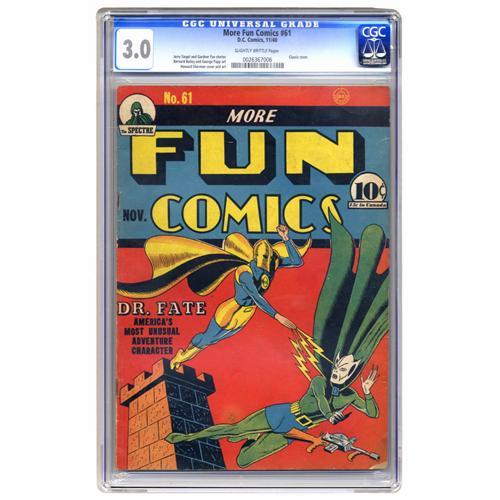 <B>More Fun Comics #61 (DC, 1940) CGC GD/VG 3.0 Slightly brittle pages.</B></I> Doctor Fate got cover billing here (he's illustrated by Howard Sherman), and inside the comic he's joined by the Spectre, Congo Bill, and others. Overstreet notes that all issues of this title are "scarce to rare." Overstreet 2006 GD 2.0 value = $348; VG 4.0 value = $696. CGC census 3/06: 1 in 3.0, 5 higher.