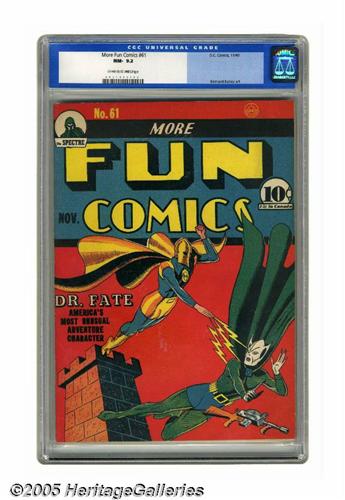 <B>More Fun Comics #61 (DC, 1940) CGC NM- 9.2 Off-white to white pages.</B></I> DC's occult heroes dominate this issue: while Doctor Fate gets cover billing, the Spectre stars in the lead story. The cover is by Howard Sherman; other artists include Bernard Baily (drawing the Spectre) and George Papp (drawing Congo Bill). Overstreet 2005 NM- 9.2 value = $4,900. CGC census 4/05: 1 in 9.2, 1 higher.<I>From the Northern Lights Collection.</B></I>