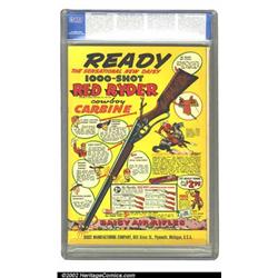 More Fun Comics #65 Mile High pedigree (DC, 1941) CGC NM 9.4 White pages. Of the many amazing books offered in Heritage's October auction, this one will certainly garner much of the attention. Bernard Baily eschewed his normal cover layouts in favor of a more ominous, personal composition. The results are startling--Bailey may have created his most classic cover with this issue. Factor in its scarcity, extremely high demand, and the Mile High pedigree, and you've got a very unique item. Perfectly clean and white, the book looks brand spanking new--we're willing to bet it's the best existing copy out there. Overstreet 2002 NM 9.4 value = $3,700. Important notice: We expect to be auctioning lots at the rate of 200-250 per hour. Sometimes eBay Premier live bid software cannot keep up with that pace, so we strongly recommend that you place a realistic proxy bid now as insurance to avoid disappointment. Also please note that all Heritage/CAA lots purchased through eBay Premier carry a 20% Buyer's Premium. Please make sure you read the Terms and Conditions.