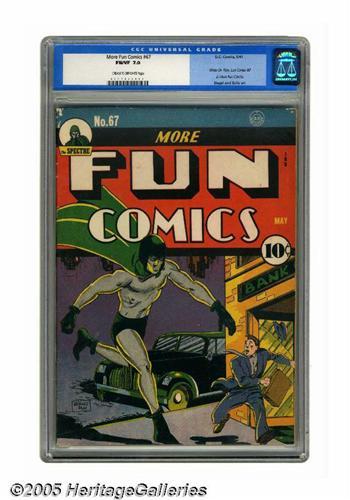 <B>More Fun Comics #67 (DC, 1941) CGC FN/VF 7.0 Cream to off-white pages.</B></I> This comic, a Gerber "7," features the first telling of the origin of the mysterious Dr. Fate. The other star of the book, the Spectre, is featured both on this Bernard Baily cover and inside the book. Two backup features had their final installments in this issue: Biff Bronson and Congo Bill -- of course, it was hardly the last hurrah for Congo Bill, who would continue on in the DC Universe in years to come. Overstreet 2005 FN 6.0 value = $2,031; VF 8.0 value = $4,739. CGC census 4/05: 1 in 7.0, 2 higher. <I>From the Northern Lights Collection.</B></I>