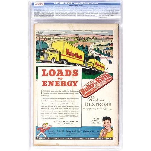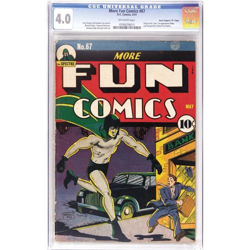 <B>More Fun Comics #67 Davis Crippen ("D" Copy) pedigree (DC, 1941) CGC VG 4.0 Off-white pages.</B></I> This is one of the most valuable "Spectre cover" issues because it features the first telling of the origin of the mysterious Dr. Fate, and thus the first appearance of his mentor, Nabu the Wise. Two backup features had their final installments in this issue, Biff Bronson and Congo Bill. Of course, it was hardly the last hurrah for Congo Bill, who would continue on in the DC Universe in years to come. The cover art is by Bernard Baily. Overstreet 2006 VG 4.0 value = $1,370. CGC census 6/06: 1 in 4.0, 7 higher. <I>From the Crippen Collection.</B></I> <BR><BR><B>Important notice:</B> Heritage usually auctions material at the rate of 200-250 lots per hour. On some occasions eBay Live bid software or the Internet may not be able to keep up with the pace of the auction. We recommend placing a realistic absentee bid now as insurance to avoid disappointment. Occasionally the auctioneer may eliminate or reject an eBay Live bid, and the auctioneer may also reopen a lot after the close of the eBay live bidding (usually because we missed an audience bid), and may reject your bid even if it shows you as the winning bidder. By bidding via eBay Live, you agree that Heritage may award the lot to another bidder at its sole discretion under the circumstances described above or any other reasonable circumstances. Since eBay bids are not shown to us until we open the lot on the floor, we treat those bids just like floor bids. In most cases the floor responds before the eBay bid is presented to us, due to Internet lag time, so for consistency we have made it a policy that floor bids are always considered first over tie eBay live bids. Also please note that all Heritage lots purchased through eBay Live carry a 22.5% Buyer's Premium. Please make sure you read the Terms and Conditions before you bid. This lot is being auctioned in conjunction with a live floor auction by Heritage Auction Galleries. All final auction and invoice information will be supplied by Heritage Auction Galleries, and all other information should be considered preliminary. Lot:41001 <BR><BR><B>Winning Notification and Billing:</B> After the FINAL session in this auction is complete, Heritage will send e-mail and snail mail invoices. This process normally takes several days. All final auction and invoice information will be supplied by Heritage Auction Galleries, and all other information should be considered preliminary. <BR><BR>This auction will be conducted on a live auction floor and over the Internet through eBay Live. If you choose to place an absentee bid, please take a moment to <font color='#0000ff'><u><a href='http://pages.ebay.com/liveauctions/help/before/laabsentee.html'>learn how eBay Live absentee bidding works</a></u></font><font color='#000000'>