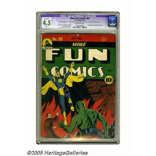 <B>More Fun Comics #69 (DC, 1941) CGC Apparent VG+ 4.5 Slight (A) Off-white pages.</B></I> Howard Sherman cover. Fred Ray, Bernard Baily, and George Papp art. CGC notes, ""Restoration includes: small amount of color touch on cover, glue on spine of cover (1 piece of tape on spine of cover)."" Overstreet 2005 GD 2.0 value = $246: VG 4.0 value = $492. <BR><BR><B>Important notice:</B> Heritage usually auctions material at the rate of 200-250 lots per hour. On some occasions eBay Live bid software or the Internet may not be able to keep up with the pace of the auction. We recommend placing a realistic absentee bid now as insurance to avoid disappointment. Occasionally the auctioneer may eliminate or reject an eBay Live bid, and the auctioneer may also reopen a lot after the close of the eBay live bidding (usually because we missed an audience bid), and may reject your bid even if it shows you as the winning bidder. By bidding via eBay Live, you agree that Heritage may award the lot to another bidder at its sole discretion under the circumstances described above or any other reasonable circumstances. Since eBay bids are not shown to us until we open the lot on the floor, we treat those bids just like floor bids. In most cases the floor responds before the eBay bid is presented to us, due to Internet lag time, so for consistency we have made it a policy that floor bids are always considered first over tie eBay live bids. Also please note that all Heritage lots purchased through eBay Live carry a 20% Buyer's Premium. Please make sure you read the Terms and Conditions before you bid. This lot is being auctioned in conjunction with a live floor auction by Heritage Galleries & Auctioneers. All final auction and invoice information will be supplied by Heritage Galleries & Auctioneers, and all other information should be considered preliminary. Lot:2167 <BR><BR><B>Winning Notification and Billing:</B> After the FINAL session in this auction is complete, Heritage will send e-mai