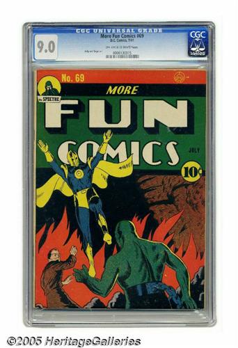 <B>More Fun Comics #69 (DC, 1941) CGC VF/NM 9.0 Off-white to white pages.</B></I> Howard Sherman drew both this issue's cover featuring Doctor Fate and the story starring the same hero. That other Justice Society stalwart, the Spectre, also appears, drawn by his regular artist Bernard Baily. This superb VF/NM copy has that pedigree-type look about it. Overstreet 2005 VF/NM 9.0 value = $2,369; NM- 9.2 value = $3,200. CGC census 1/05: 1 in 9.0, 1 higher. <I>From the Northern Lights Collection.</B></I>