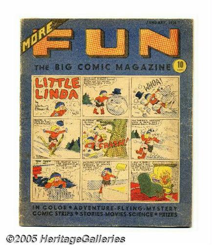 <B>More Fun Comics #7 (DC, 1936) Condition: VG+.</B></I> With this issue, <B>More Fun</B></I> was born, having changed over from <B>New Fun</B></I> due to the addition of <B>New Comics</B></I> to the burgeoning DC line. Reduced in size, this issue (and the next) would appear as magazine size, and display paper covers. The spine of this unrestored copy exhibits light scuffing, with a small 3/4" split at the top and bottom, and is still tight on all three staples. The margins contain a handful of small tears, but no chips or creases are evident. The interior pages are off-white and very supple. Considering the rarity and age of this book, it's a miracle it has survived so long in nice shape. Overstreet 2005 VG 4.0 value = $1,560. <I>From the Northern Lights Collection</B></I>.