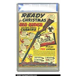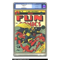 More Fun Comics #74 (DC, 1941) CGC VF/NM 9.0 Off-white pages. Dr. Fate gets down to business, plowing through a host of red-suited baddies as he pushes huge blocks of stone aside as if they were made of styrofoam. This issue is also the second appearance of Aquaman and Green Arrow. Exhibiting a light dust shadow, this copy doesn't reveal much else wrong with it. The edges are sharp, and the spine is free of dirt or stress lines. Considering the rarity of More Funs, this is most likely one of the top existing copies on the planet. Overstreet 2002 NM 9.4 value = $3,000. Important notice: We expect to be auctioning lots at the rate of 200-250 per hour. Sometimes eBay Premier live bid software cannot keep up with that pace, so we strongly recommend that you place a realistic proxy bid now as insurance to avoid disappointment. Also please note that all Heritage/CAA lots purchased through eBay Premier carry a 20% Buyer's Premium. Please make sure you read the Terms and Conditions.