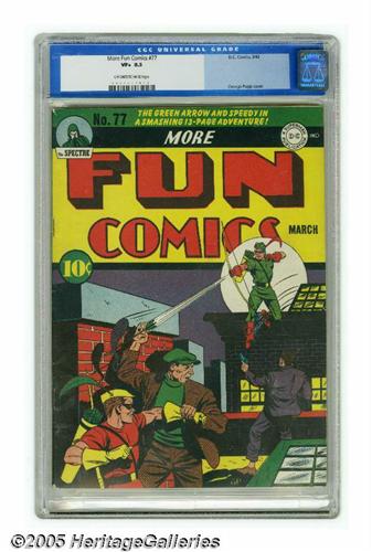 <B>More Fun Comics #77 (DC, 1942) CGC VF+ 8.5 Off-white to white pages.</B></I> Simply sparkling colors on this high-grade copy highlight George Papp's cover starring Green Arrow and Speedy, the duo's first cover. Papp, Howard Sherman, Bernard Baily, and Mort Meskin art. Overstreet 2005 VF 8.0 value = $1,275; VF/NM 9.0 value = $1,963. CGC census 1/05: 2 in 8.5, 1 higher. <I>From the Northern Lights Collection</B></I>.