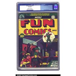 More Fun Comics #77 (DC, 1942) CGC VF+ 8.5 Off-white to white pages. A fun cover sets the mood for this pretty issue of More Fun. This issue is the first of Green Arrow and Speedy's run on the cover. The Spectre story inside is another highlight. This copy's clean appearance and rich, vibrant colors are a joy to behold; only one has been graded higher by CGC. Overstreet 2002 VF 8.0 value = $1,250. Important notice: We expect to be auctioning lots at the rate of 200-250 per hour. Sometimes eBay Premier live bid software cannot keep up with that pace, so we strongly recommend that you place a realistic proxy bid now as insurance to avoid disappointment. Also please note that all Heritage/CAA lots purchased through eBay Premier carry a 20% Buyer's Premium. Please make sure you read the Terms and Conditions.