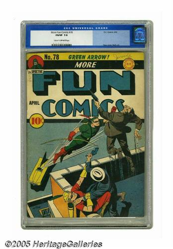 <B>More Fun Comics #78 (DC, 1942) CGC FN/VF 7.0 Cream to off-white pages.</B></I> When Green Arrow debuted, one of his main gimmicks was that his car, the "Arrowplane," was equipped with a catapulting seat, demonstrated nicely on this George Papp cover. This was a very early appearance for the character, who had first appeared in issue #73 of this title and didn't take over the cover until #77. This issue's other features include the Spectre (drawn by Bernard Baily), Doctor Fate, Aquaman, and Johnny Quick. Overstreet 2005 FN 6.0 value = $612; VF 8.0 value = $1,275. CGC census 1/05: 1 in 7.0, 5 higher. <I>From the Northern Lights Collection.</B></I>