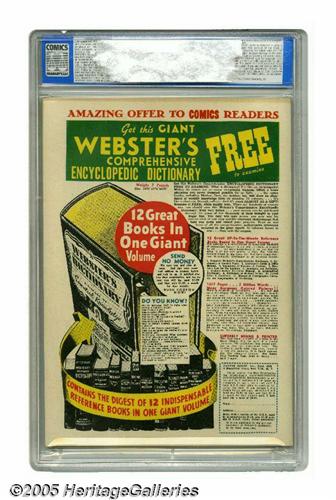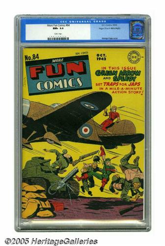 <B>More Fun Comics #84 Mile High pedigree (DC, 1942) CGC NM+ 9.6 White pages.</B></I> Once you've looked at this perfect Edgar Church copy, you will forget about all others. But just in case you are thinking of looking elsewhere for a high-grade specimen, note that the next highest-graded in CGC's census is a mere VG/FN! This issue's got a Japanese war cover by George Papp, featuring Green Arrow and Speedy. Also on hand in the issue are Doctor Fate, Aquaman, Johnny Quick and the Spectre. Overstreet 2005 NM- 9.2 value = $1,775. CGC census 7/05: 1 in 9.6, none higher.