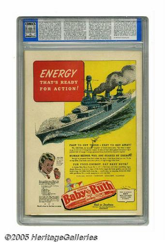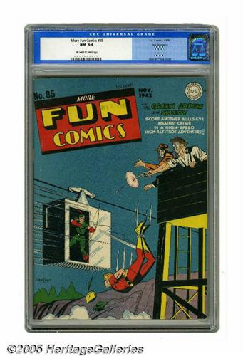 <B>More Fun Comics #85 San Francisco pedigree (DC, 1942) CGC NM 9.4 Off-white to white pages.</B></I> This gem of a copy comes from the Tom Reilly "San Francisco" collection, considered by many as second only to the Mile High pedigree. It certainly is a terrific, fresh-looking comic from the World War II era. <B>More Fun</B></I> is DC's oldest series, which started as <B>New Fun Comics</B></I> in 1935, and it offers a daunting challenge for the collector at any grade -- Overstreet notes that "all issues are scarce to rare." This is the only copy of #85 that has earned a CGC grade higher than VF 8.0. George Papp created the Green Arrow/Speedy cover. Features include Doctor Fate, Aquaman, Johnny Quick (with Mort Meskin art), and the Spectre. Overstreet 2005 NM- 9.2 value = $1,725. CGC census 6/05: 1 in 9.4, none higher.