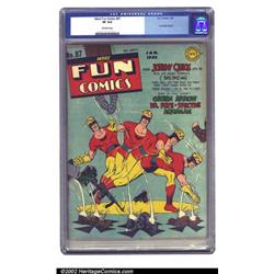 More Fun Comics #87 (DC, 1943) CGC VF 8.0 Off-white pages. It's hard to resist a More Fun cover with Johnny Quick! And with Aquaman, Green Arrow, Dr. Fate and the Spectre, you just can't go wrong with this comic. This issue also has the Radio Squad's last appearance in the title. A clean, attractive cover with equally clean, tight staples. Here is a superior copy of a great comic. Overstreet 2002 VF 8.0 value = $795. Important notice: We expect to be auctioning lots at the rate of 200-250 per hour. Sometimes eBay Premier live bid software cannot keep up with that pace, so we strongly recommend that you place a realistic proxy bid now as insurance to avoid disappointment. Also please note that all Heritage/CAA lots purchased through eBay Premier carry a 20% Buyer's Premium. Please make sure you read the Terms and Conditions.