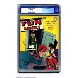 More Fun Comics #88 (DC, 1943) CGC VF 8.0 Off-white page. Here is a great-looking copy mimicking the appearance of a pedigree book. Cliff Young does the Green Arrow cover. As with so many issues of this title, this book is listed as "uncommon" by Gerber in his The Photo-Journal Guide to Comic Books, so that would make this copy doubly uncommon. It's the second nicest copy of the issue CGC has graded to date. Overstreet 2002 VF 8.0 value = $795. Important notice: We expect to be auctioning lots at the rate of 200-250 per hour. Sometimes eBay Premier live bid software cannot keep up with that pace, so we strongly recommend that you place a realistic proxy bid now as insurance to avoid disappointment. Also please note that all Heritage/CAA lots purchased through eBay Premier carry a 20% Buyer's Premium. Please make sure you read the Terms and Conditions.