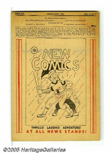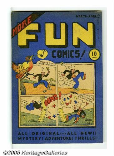 <B>More Fun Comics #9 Promotional Cover Announcement (DC, 1936).</B></I> <B>More Fun Comics</B></I> #9 is a rare comic in its own right -- Overstreet calls it "very rare," Gerber rates it a "9" -- as the very first standard-sized comic book with original material (and the last <B>More Fun</B></I> multi-panel cover), it's mind-boggling to consider how extraordinary this promotional announcement must be! This early, historic cover announcement has standard indicia information on the back, with an ad for <B>New Comics</B></I> #4. The front is stamped "Sample Copy" in ink, and like the rest of the cover announcements offered in this auction, there are two horizontal folds to facilitate mailing in a standard business envelope. Other than staple holes at the top left corner, this announcement is in Excellent condition.