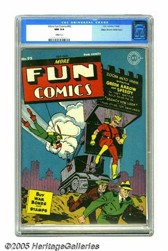 <B>More Fun Comics #92 Mile High pedigree (DC, 1943) CGC NM 9.4 White pages.</B></I> Edgar Church was more a saver of comics than a reader of comics... thank goodness. But in this case, he may have missed out, considering the issue's all-star lineup that includes Green Arrow, Doctor Fate, Aquaman, Johnny Quick, and the Spectre. The issue's artists include Cliff Young (who also drew the cover) and Mort Meskin. Overstreet 2005 NM- 9.2 value = $1,125. CGC census 7/05: 1 in 9.4, 1 higher.