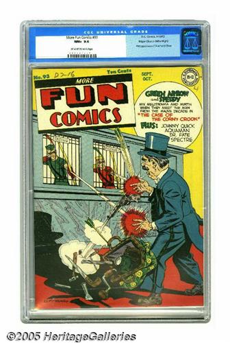 <B>More Fun Comics #93 Mile High pedigree (DC, 1943) CGC NM+ 9.6 Off-white to white pages.</B></I> Trivia question: name Green Arrow's sidekick. We're sure everyone got that one right: Speedy... or is it? Here's an unusual issue of <B>More Fun</B></I> starring the pair that names him "Speddy" on the cover! Make no mistake, it's the only thing wrong with this incredible copy. Thank you Edgar Church, wherever you are, for saving your comic books in such nice condition for us to enjoy today! And there's plenty to enjoy, too, including stories starring Johnny Quick, Aquaman, Dr. Fate, and the Spectre, not to mention the very first appearance of those twin detectives, Dover and Clover! Overstreet 2005 NM- 9.2 value = $1,125. CGC census 7/05: 1 in 9.6, none higher.