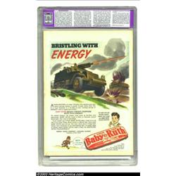 More Fun Comics #94 (DC, 1943) Apparent NM- 9.2 Moderate (P) Cream to off-white pages. This cover by Cliff Young packs quite a punch -- and so do its stars, Green Arrow and Speedy, as they kayo a pair of pilferers. Mort Meskin pencils the Johnny Quick story inside; and Aquaman, Doctor Fate, and the Spectre are the superstars also among the line-up. CGC notes, "Restoration includes: color touch, pieces added, cleaned, reinforced." Overstreet 2003 GD 2.0 value = $80; VG 4.0 value = $160; FN 6.0 value = $240; VF 8.0 value = $500; VF/NM 9.0 value = $715. Important notice: Heritage usually auctions material at the rate of 200-250 lots per hour. On some occasions eBay Live bid software or the Internet may not be able to keep up with the pace of the auction. We recommend placing a realistic absentee bid now as insurance to avoid disappointment. Occasionally the auctioneer may eliminate or reject an eBay Live bid, and the auctioneer may also reopen a lot after the close of the eBay live bidding (usually because we missed an audience bid), and may reject your bid even if it shows you as the winning bidder. By bidding via eBay Live, you agree that Heritage may award the lot to another bidder at its sole discretion under the circumstances described above or any other reasonable circumstances. Also please note that all Heritage lots purchased through eBay Live carry a 20% Buyer's Premium. Please make sure you read the Terms and Conditions before you bid.
