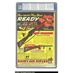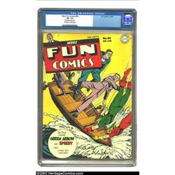 More Fun Comics #95 (DC, 1944) CGC VF- 7.5 Off-white to white pages. The color quality of this book hints at a higher grade, but CGC explains, "Rusted staple, stains pages". Rated as "uncommon" by Gerber, only three copies of the issue have graded as high. Overstreet 2002 VF 8.0 value = $500. Important notice: We expect to be auctioning lots at the rate of 200-250 per hour. Sometimes eBay Premier live bid software cannot keep up with that pace, so we strongly recommend that you place a realistic proxy bid now as insurance to avoid disappointment. Also please note that all Heritage/CAA lots purchased through eBay Premier carry a 20% Buyer's Premium. Please make sure you read the Terms and Conditions.