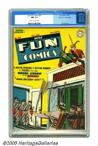 <B>More Fun Comics #97 Mile High pedigree (DC, 1944) CGC NM+ 9.6 Off-white to white pages.</B></I> There's nothing that will put you in a good mood quite like having the fresh colors of a Mile High beaming at you! This issue has a Green Arrow cover by Cliff Young. Another highlight of the book is the artistic team-up of Mort Meskin (pencils) and Joe Kubert (inks) on the Johnny Quick feature. Other characters here are the Spectre (drawn by Bernard Baily), Aquaman, and Doctor Fate, as well as the comedic antics of Dover and Clover. Overstreet 2005 NM- 9.2 value = $1,125. CGC census 7/05: 1 in 9.6, none higher.