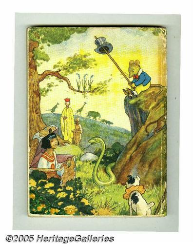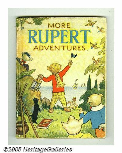<B>More Rupert Adventures (Daily Express, 1943).</B></I> Rupert and his assorted friends grace the cover of this "War Economy Standard" book from 1943. The covers have some edge wear and rubbing and some slight creasing at the corners. The first page has the "Book Belongs to" filled in with pencil writing, and the frontispiece has been colored in with crayon. The contents are tight, and quite clean, with sparkling color. A great copy of this early edition!