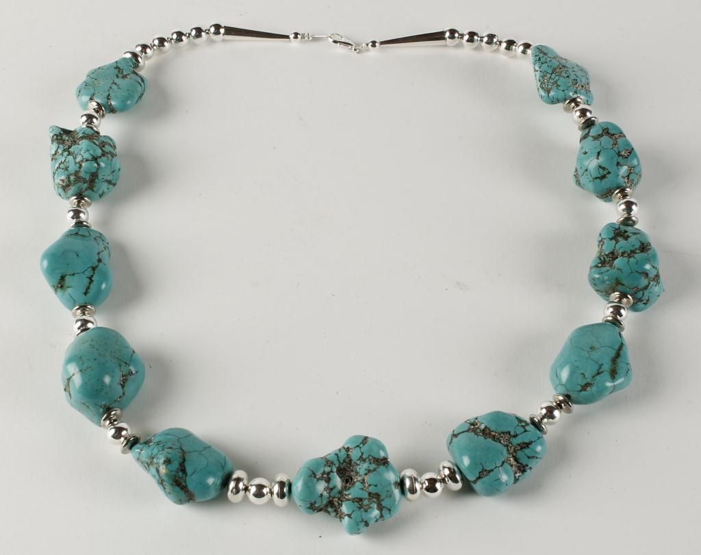 Very heavy turquoise. Necklace measures 24"L.