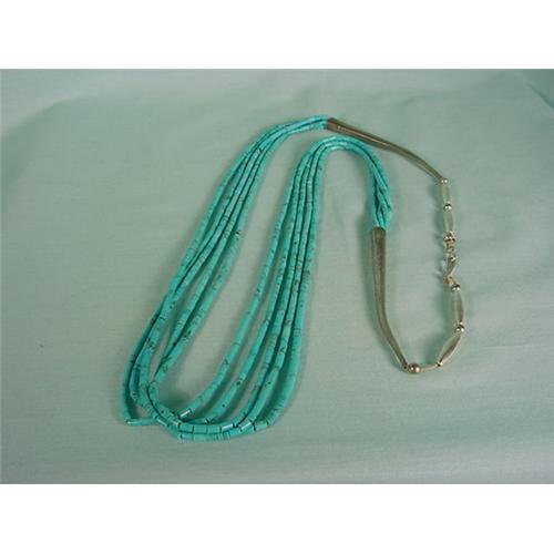 5 Strands of Beautiful Natural Morenci Turquoise Heishe Beads ** 32 inch Long ** Silver Findings are 3 inch Long and Curved for Better Fit on the Neck ** No Longer Made of Untreated Turquoise ** Very Smooth and Beautiful