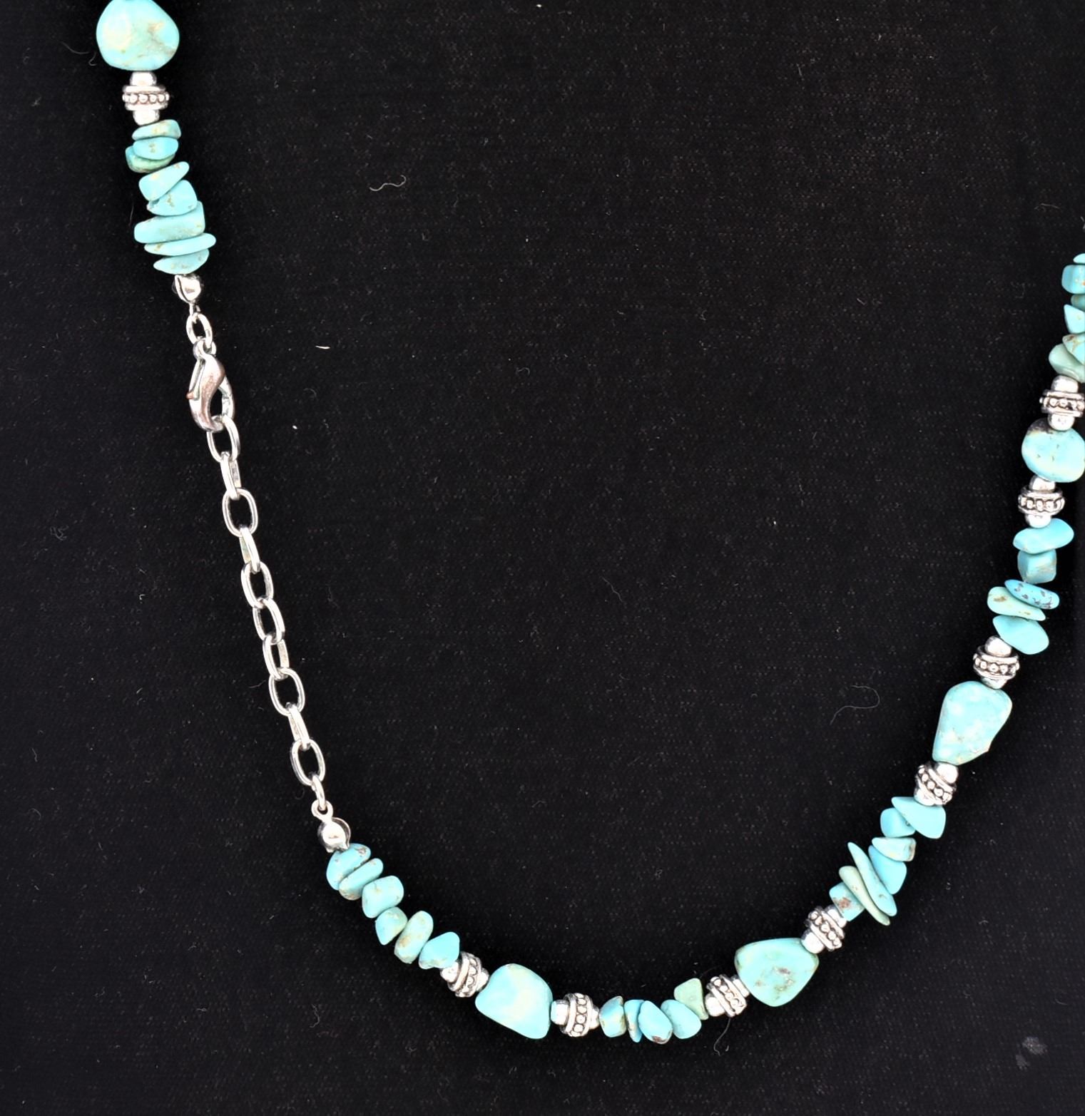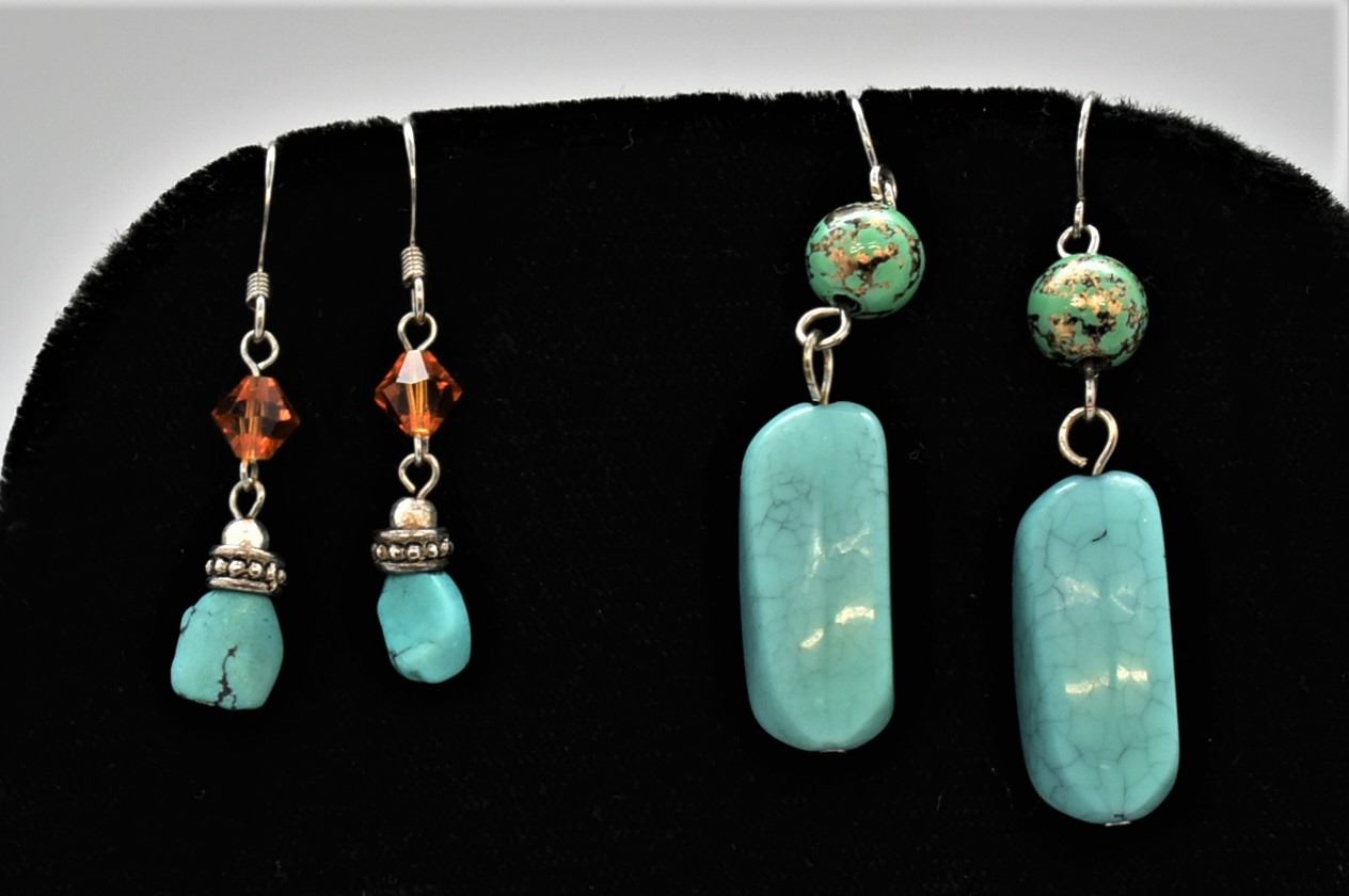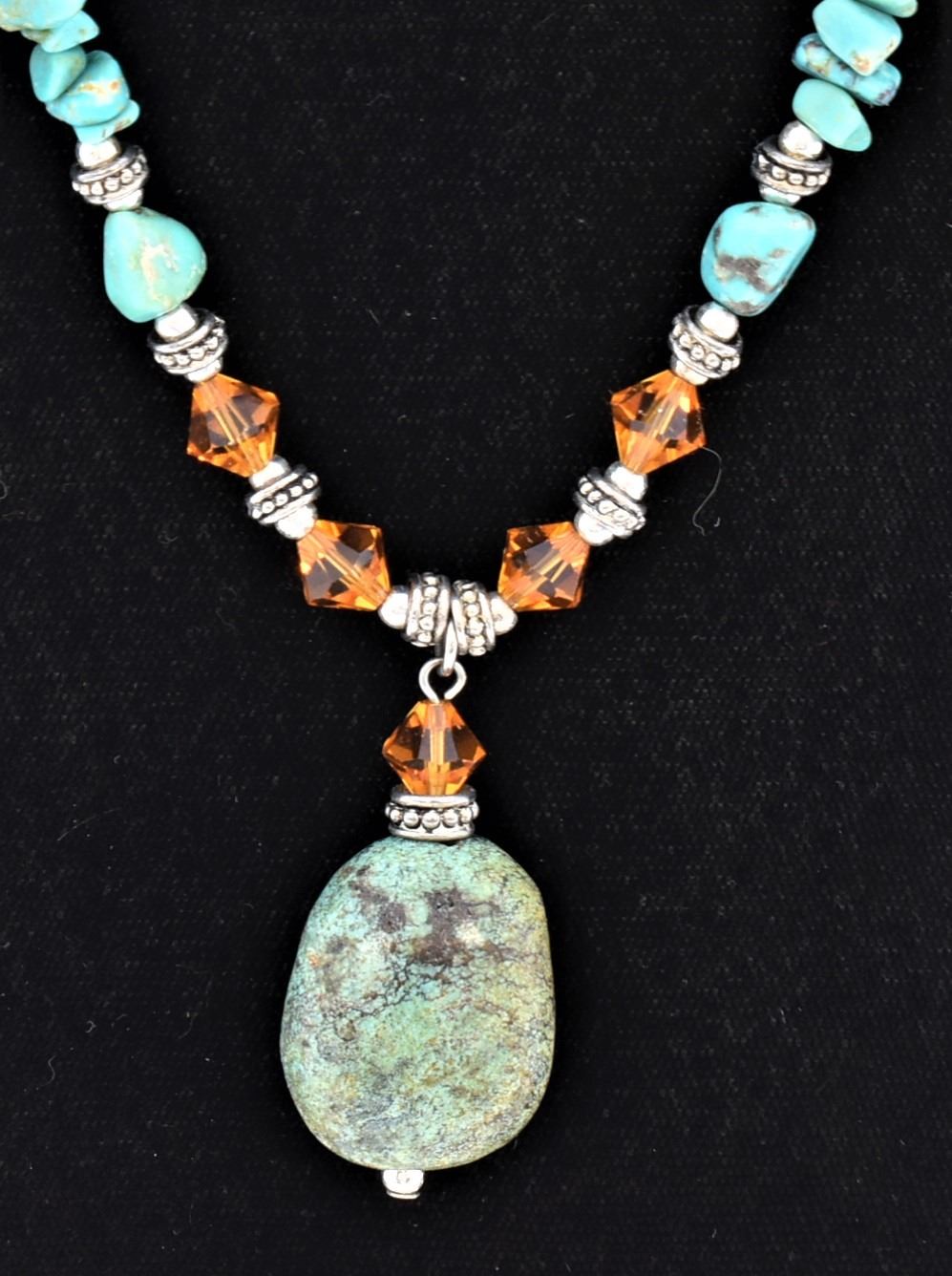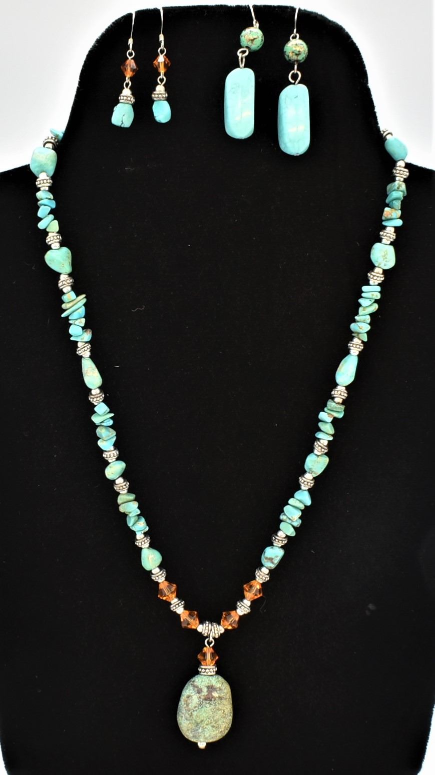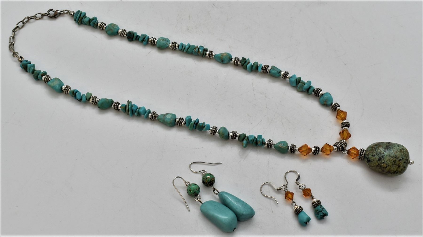 Estate Morenci Turquoise Nugget Pendant Necklace & 2 Pairs of Earrings, necklace measures, pendant measures 1.75''L x 7/8''W, necklace measures 19''L end to end and has faceted amber glass and silver bead accents, total gram wt. on necklace 39.75, matching earrings measure 1.5''L which includes the wire, also includes turquoise bead earrings measuring 2''L which includes the wire