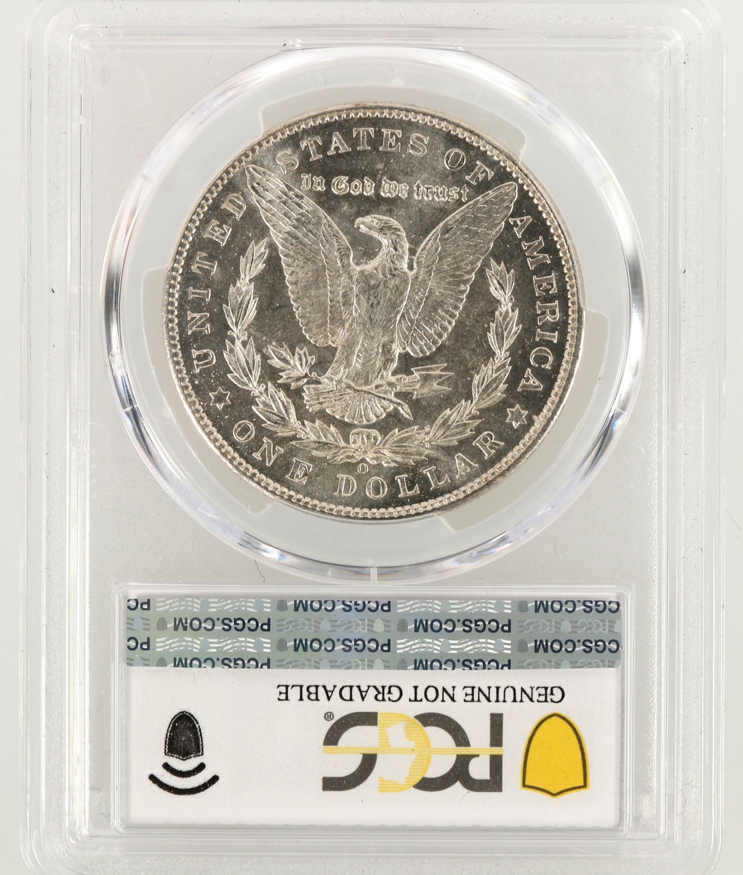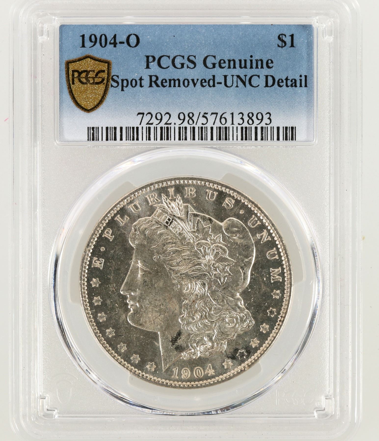 PCGS graded 1904-O Morgan Dollar: Genuine UNC Detail Spot Removed. Mirror like fields, few flaws, a coin that would look better without the grading opinion.