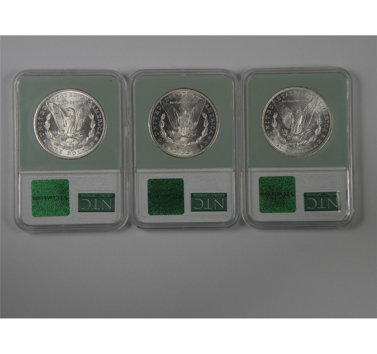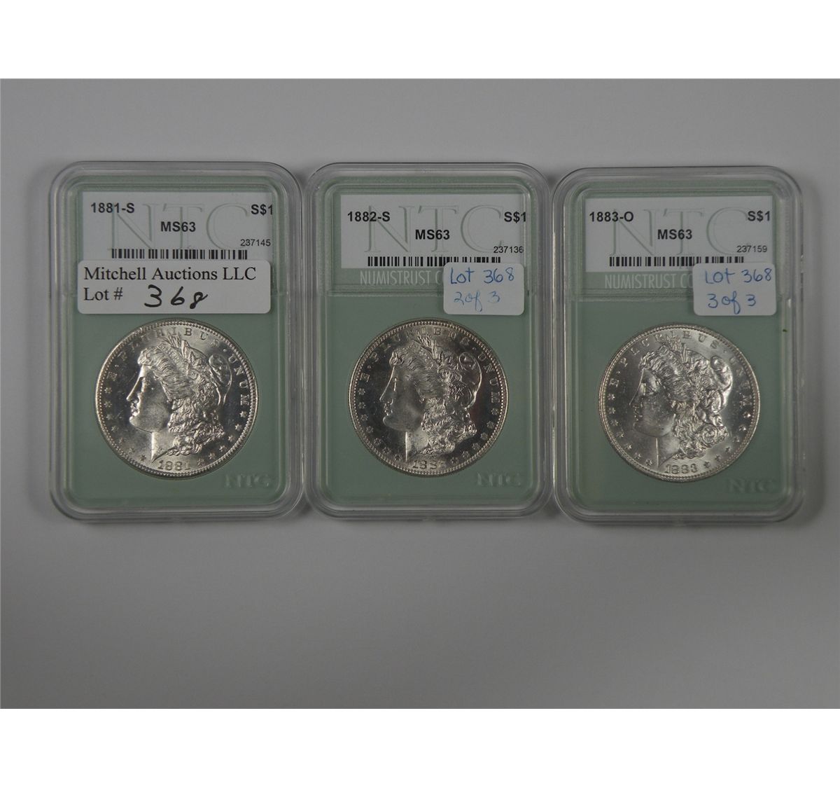 Morgan Dollar Trio: 1881-S, 1882-S, 1883-O. All NTC MS63 and all quite attractive. A total of 3 coins. Est.$150