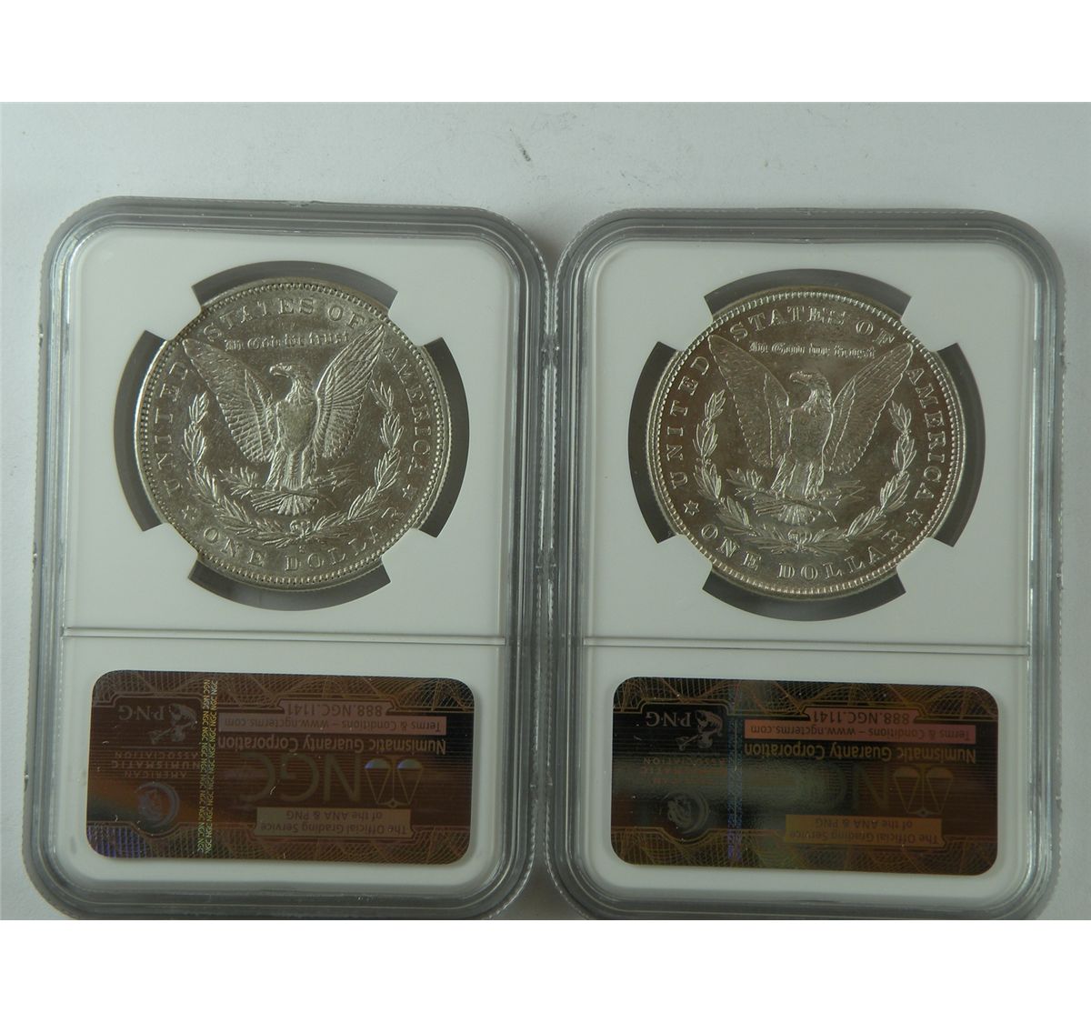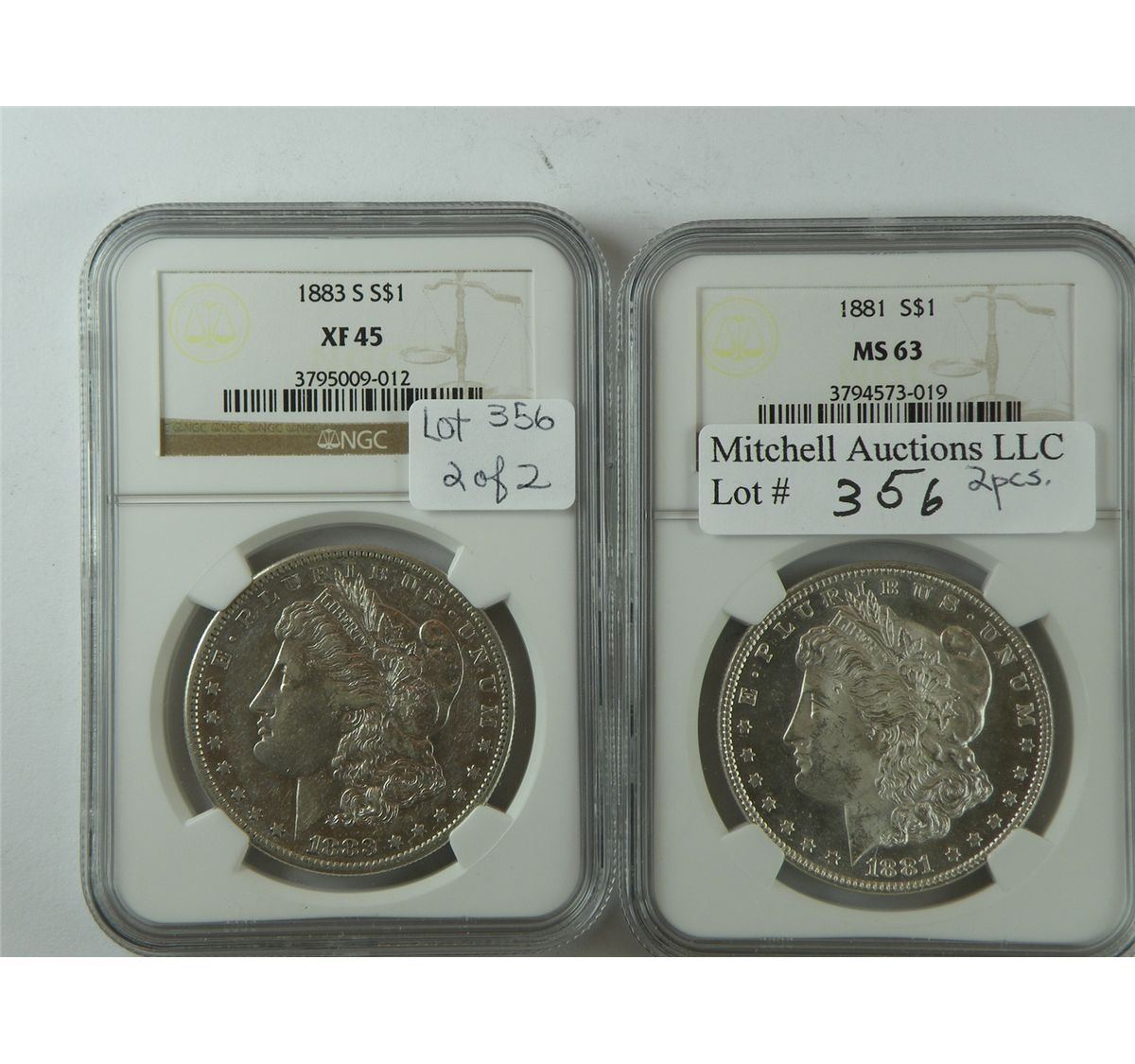 Morgan Dollar twosome: 1881 NGC MS63 Semi- reflective and toned a subtle gold; 1883-S NGC XF45 Light even wear. A total of 2 coins. Est.$110