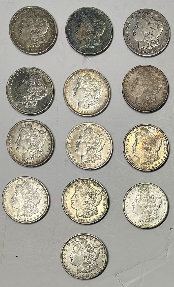 Morgan Dollars, 1879-1921, a group of 13. All circulated, some with lovely toning