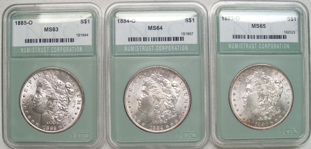 1) 1883. NTC rated MS-65. #192023. Our rating is MS-63. 2) 1884. NTC rated MS-64. #151857. Our rating is MS-62/63. 3) 1885. NTC rated MS-63. #151994. Our rating is MS-62. Notice that our ratings are mush lower. We have tried to be very conservative. VMA varieties were no checked. PLEASE PREVIEW THESE COINS!