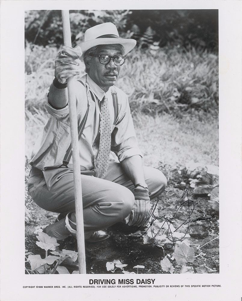 Glossy 8 x 10 publicity photo of Freeman in the 1989 film Driving Miss Daisy, signed in black felt tip. In fine condition. Freeman was nominated for the Academy Award for Best Actor in a Leading Role for his portrayal of Hoke Colburn in the modern classic.