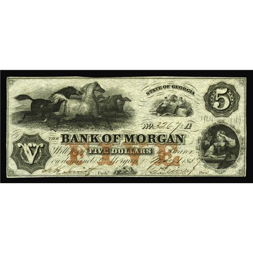 <B>Morgan, GA- Bank of Morgan</B></I> $5 May 1, 1857 G8a<BR>This is the highest grade we have seen for this denomination from this fraudulent bank. <B>Choice Crisp Uncirculated.</B></I>