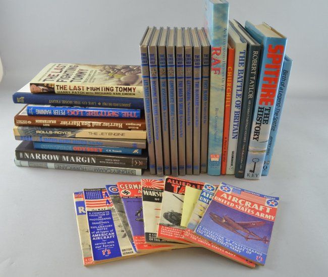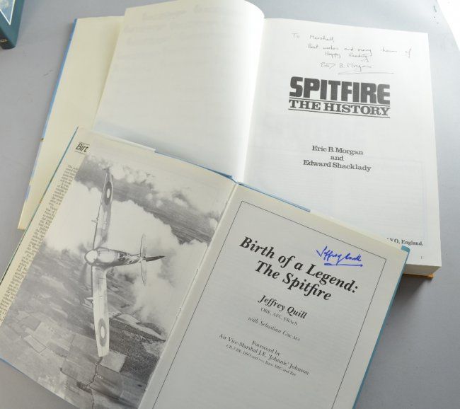 Morgan & Shacklady, Spitfire, The History pub. Key Publishing Ltd, second imp 1988, signed and inscribed by one of the authors, in price clipped dust jacket, together with Quill, Birth of a Legend - The Spitfire, pub. Quiller Press Ltd, signed by the author, in non price-clipped dust jacket and a quantity of other militaria books and magazines