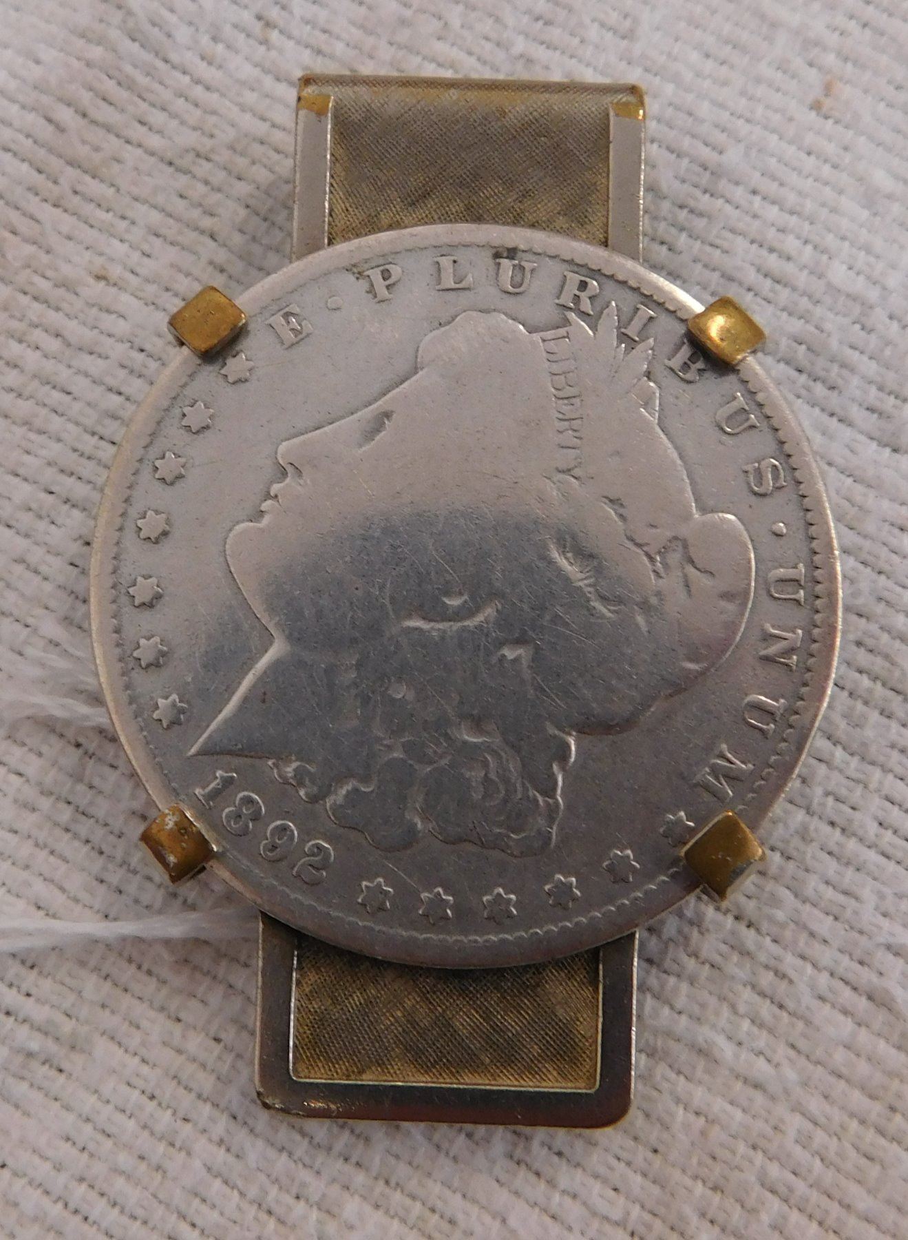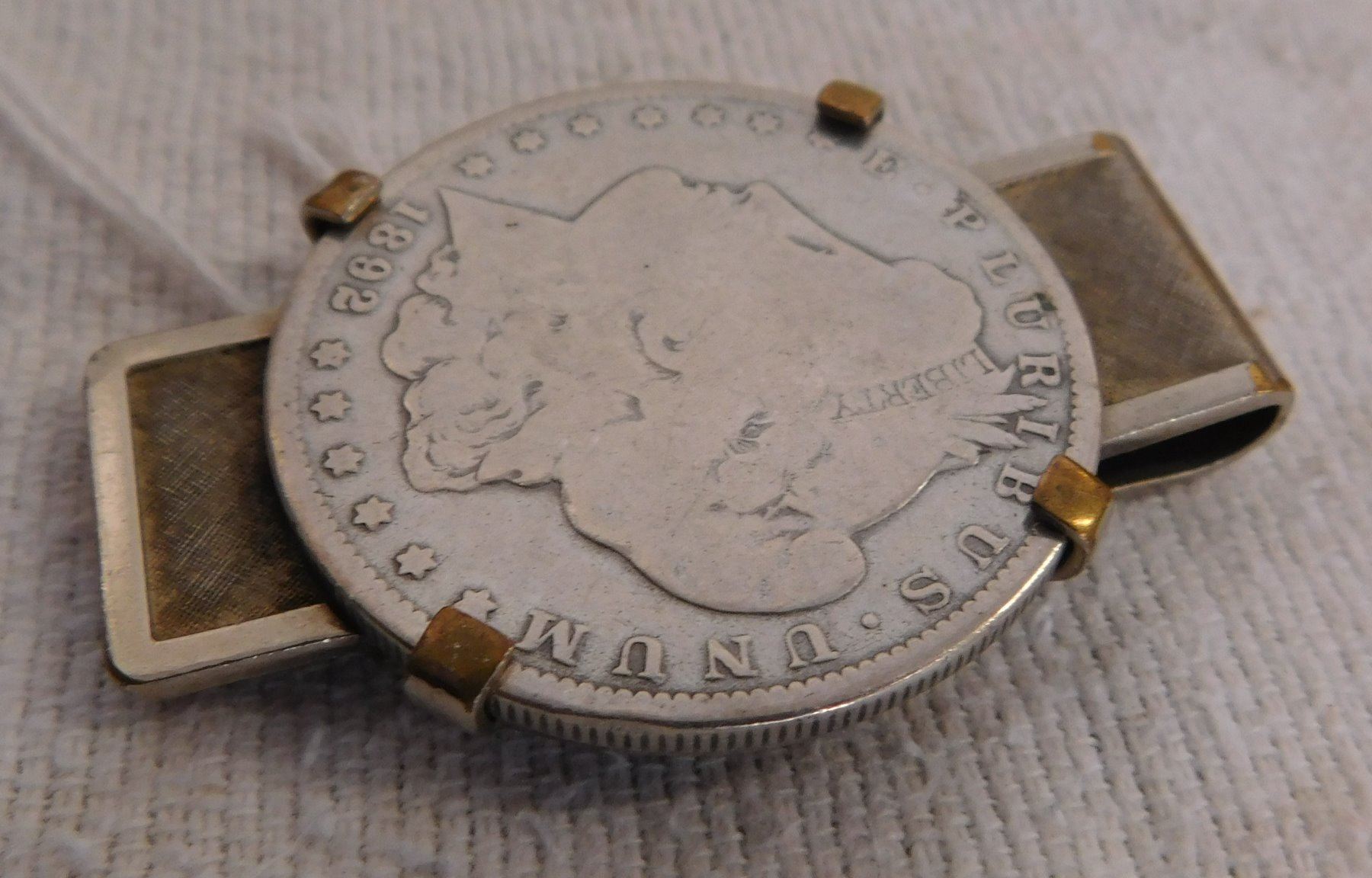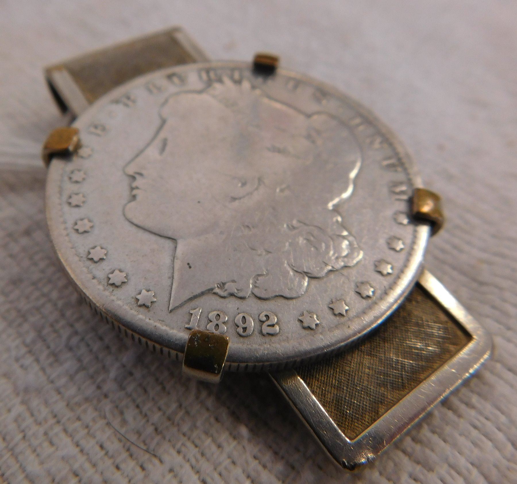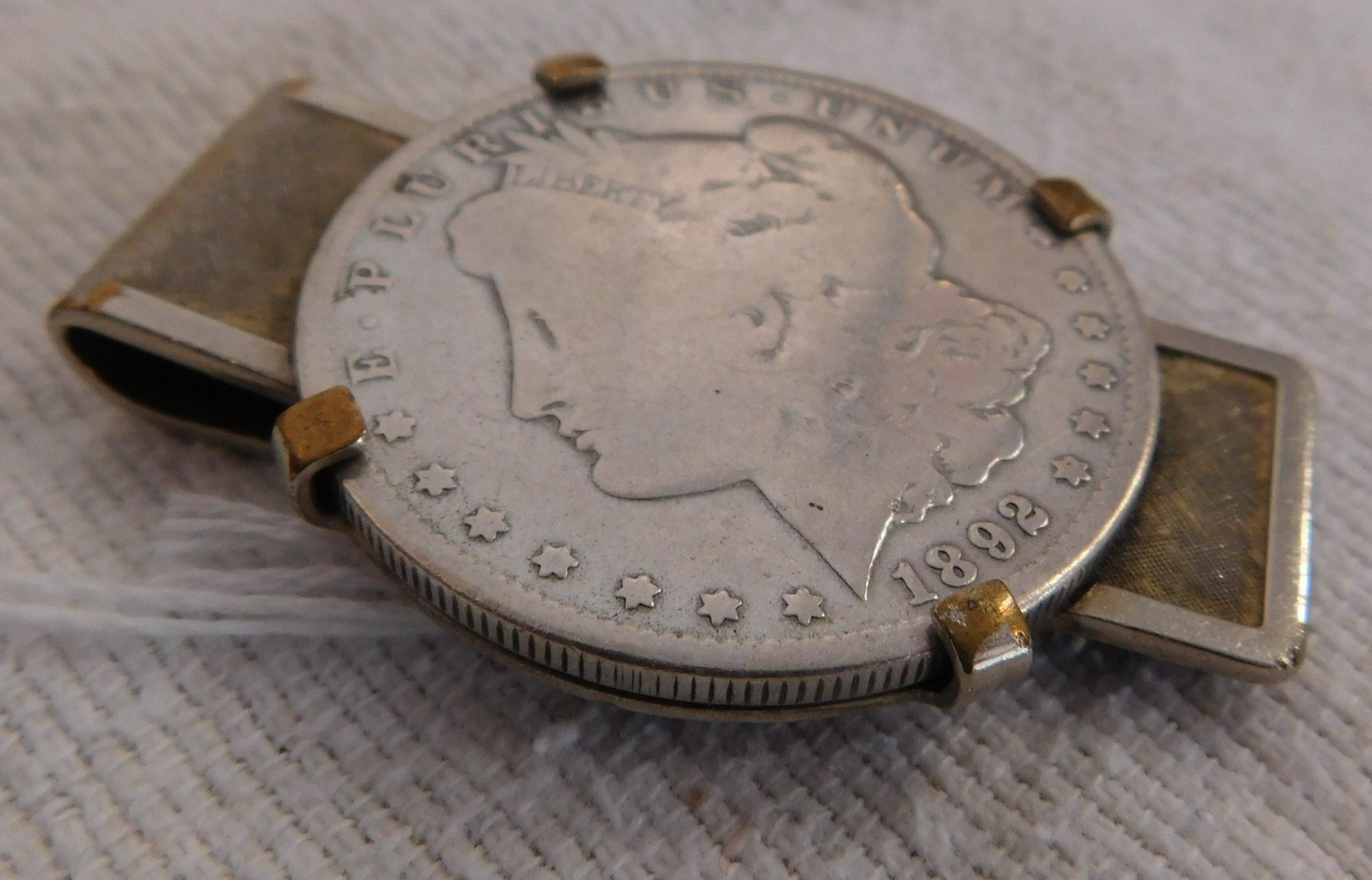 Morgan Silver Dollar Money Clip, coin is marked 1882. Made of coin silver and metal clip, the item measures 1 1/2" x 2 1/2". USA. Good Morgan silver dollar. Condition: Worn, see images. Shipping: $12.50 w/insurance and signature.