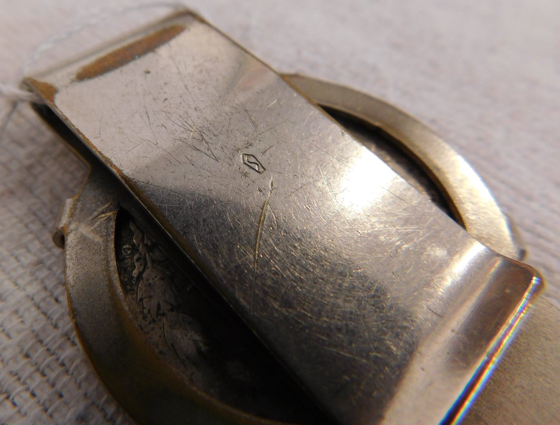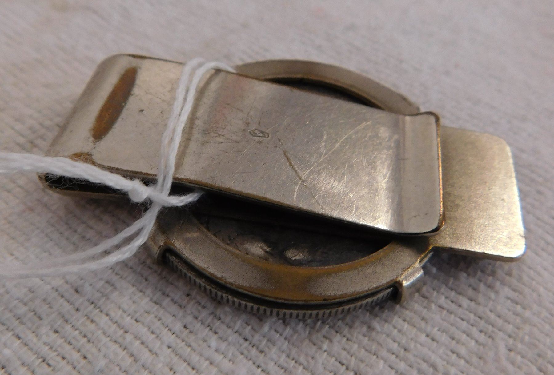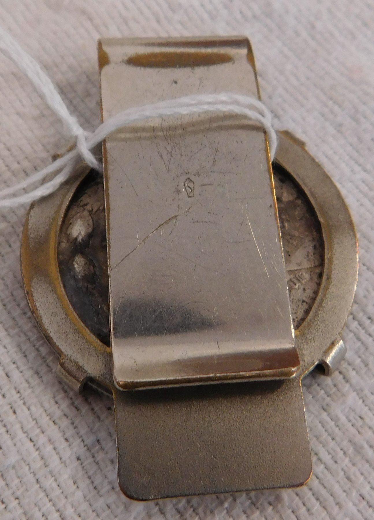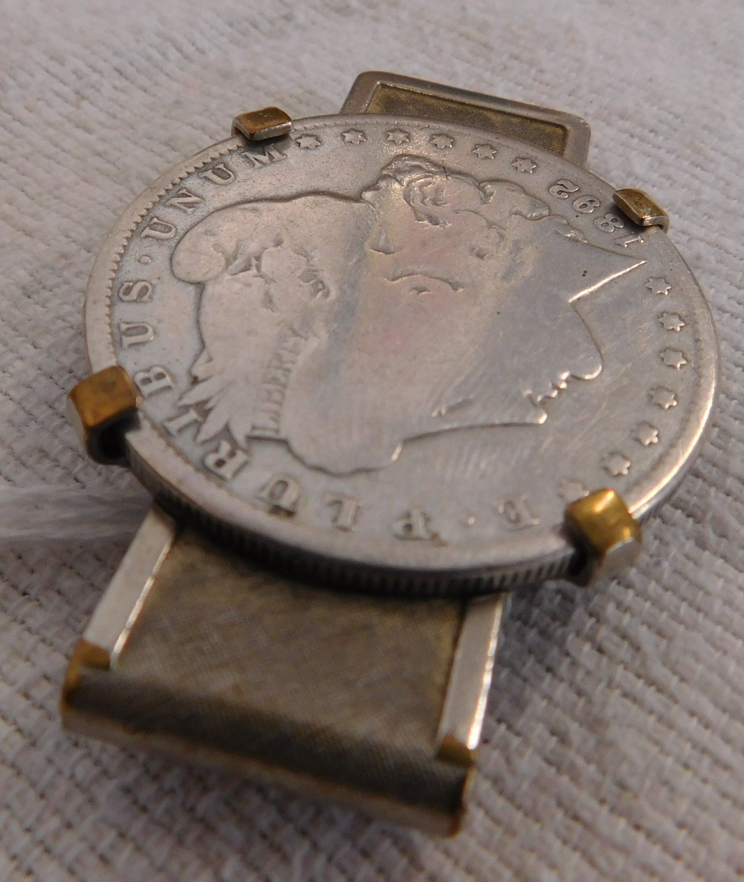 Morgan Silver Dollar Money Clip, coin is marked 1882. Made of coin silver and metal clip, the item measures 1 1/2" x 2 1/2". USA. Good Morgan silver dollar. Condition: Worn, see images. Shipping: $12.50 w/insurance and signature.