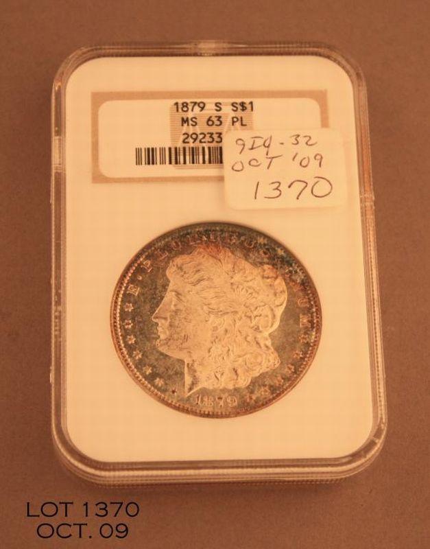 Morgan Silver Dollar dated 1879-S NGC graded MS63 PL and in slab. Est.: $400-$800.