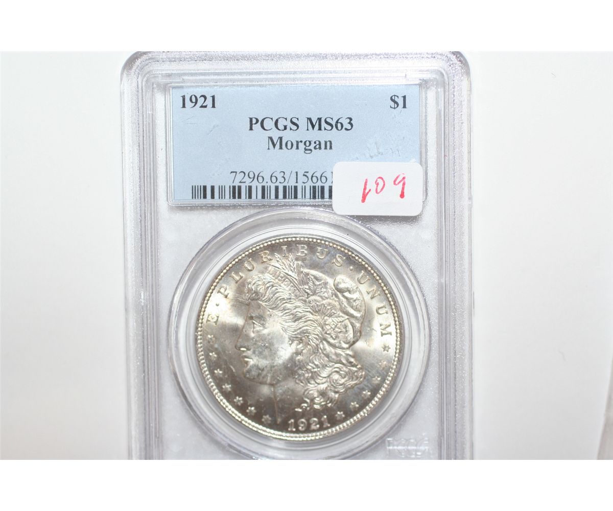 This lot is a pcgs graded 1921 morgan dollar; ms-63