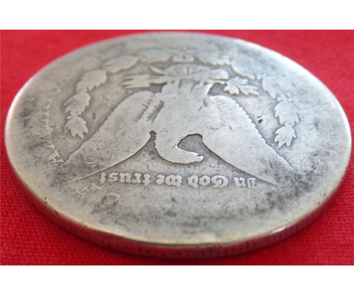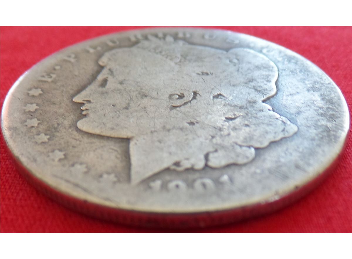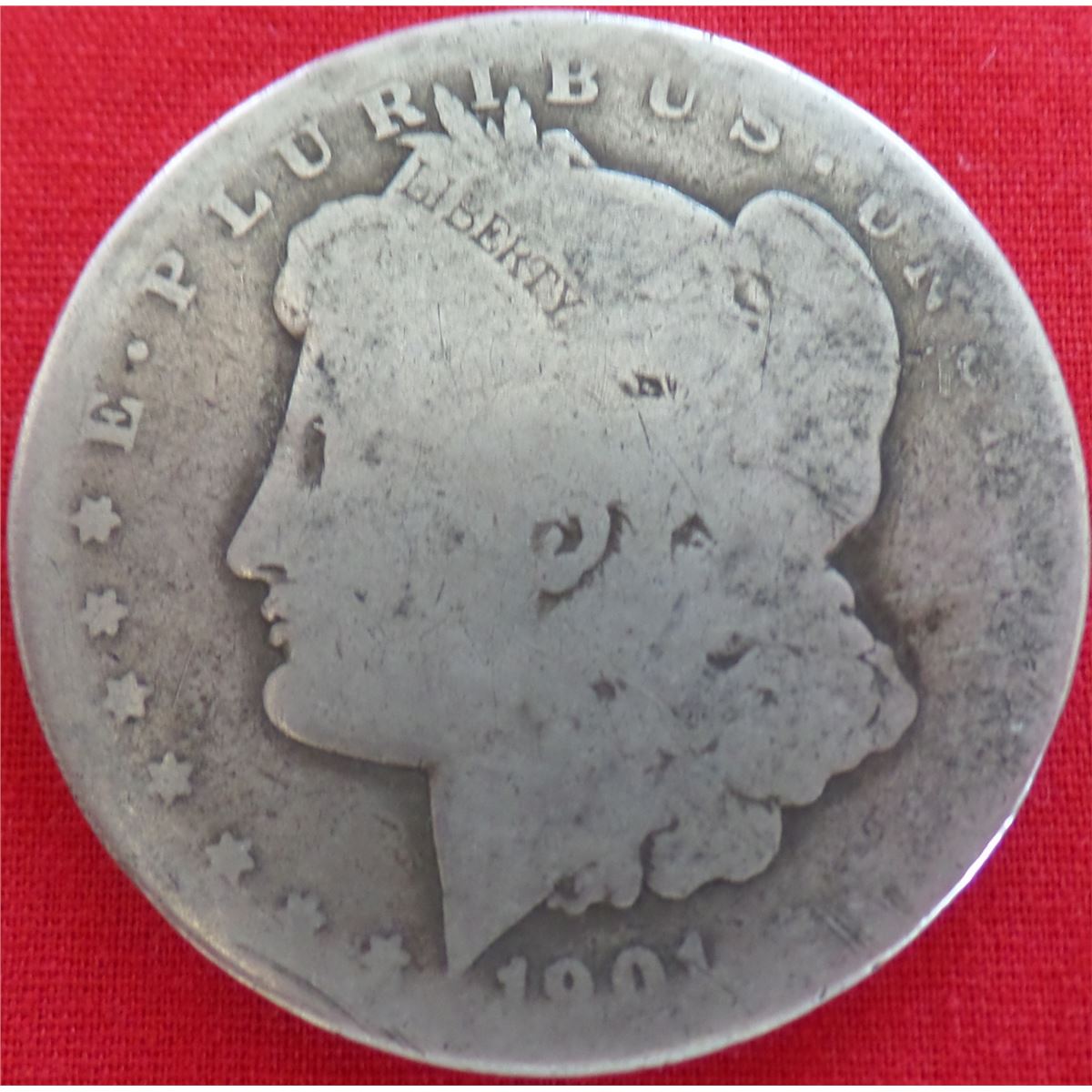 Morgan Silver Dollar from 1901. Made of coin silver and measuring 1.5" x 1/8". Good old western silver dollar relic. Condition: Well worn, old silver dollar. Shipping: $12.