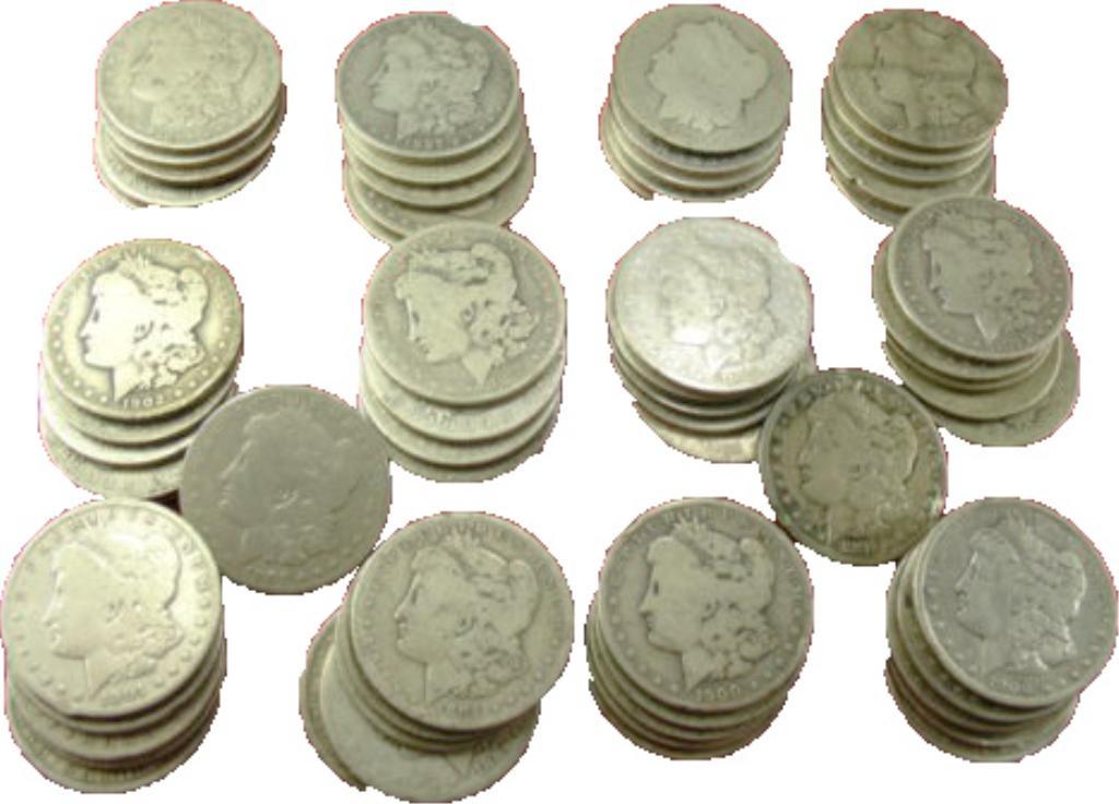 A lot with 50 Morgans- Various Dates- Grades and Mints. Average circulated approximate grade. One bid wins the entire lot. From the lockbox of a recent estate