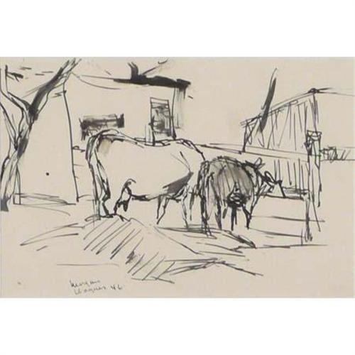 8027 Morgan Wagner (1917-1950) Pen "Feeding" Signed lower left '46 7" x 10"