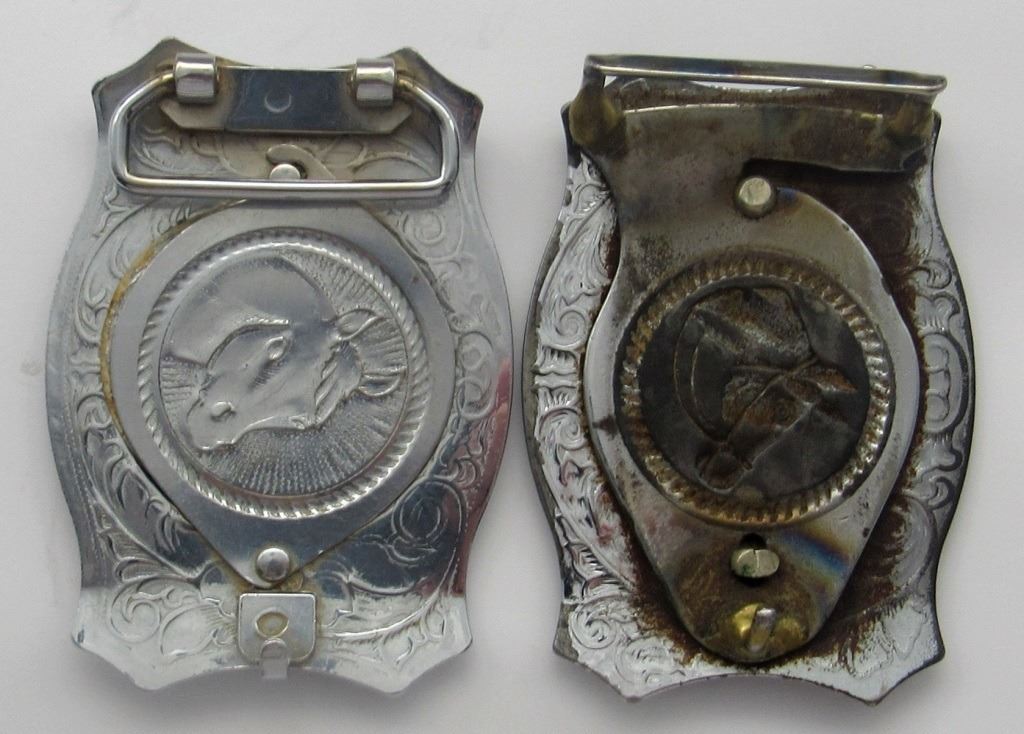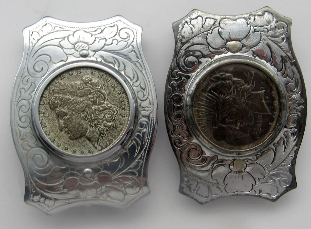 1886 Morgan and 1922 Peace Dollar set in belt buckles with ornate horse designs