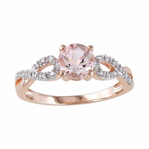 This 10k rose gold engagement ring features a beautiful twist design with a genuine morganite center stone and shimmering diamonds.