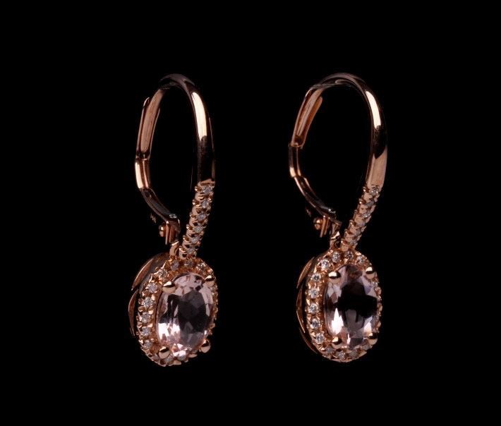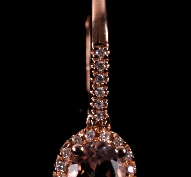 This is a gorgeous set of 14k Rose Gold bright Morganite and Diamond Lever Back dangle earrings. At the center of the 14k Rose Gold Lever Back dangle earrings is a beautiful and bright Morganite stone showing a oval bright beautiful cut with peach pink coloring with nice eye clean transparent clarity with a collective size of 1.41 carats and surrounded by 24 round brilliant natural diamonds on each earring collectively weighing 0.18 carats and the gold weight is 2.17. The Color Jewels hallmark can be seen on side of Lever Back.